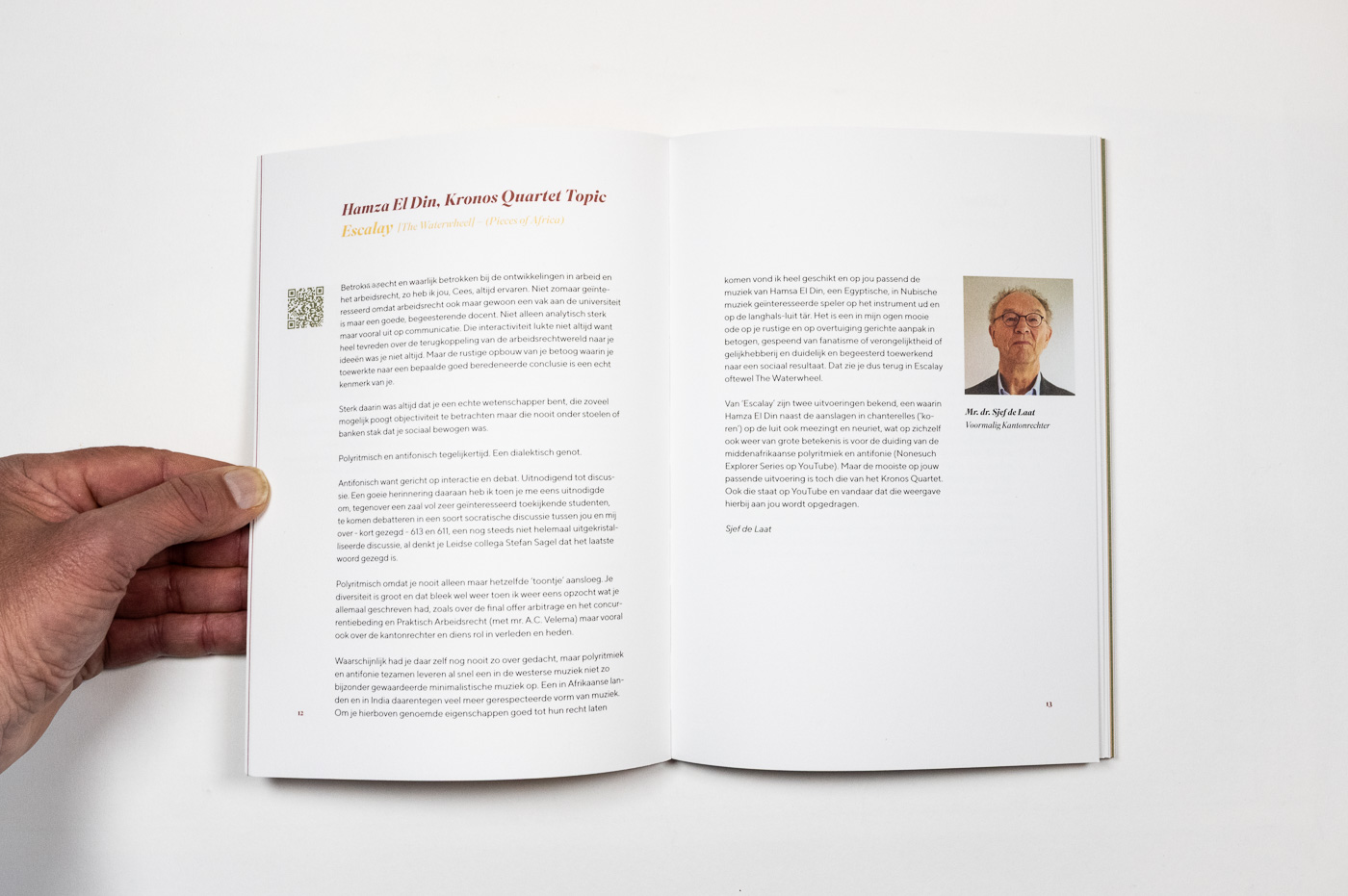 Liber Amicorum, gemaakt voor het afscheid van Cees Loonstra, samengebracht rond het thema muziek. Collega’s schrijven over hun favoriete muziekstuk en in het tweede deel van het boekje komt muziek in de kunst aan bod. Mooi gedrukt door Wilco Art op een zacht houtvrij offsetpapier.